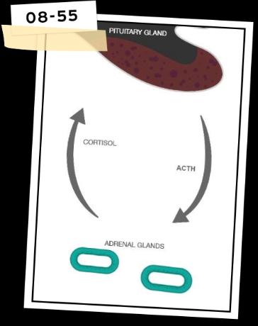 Le cortisol est produit par les surrénales, deux petites glandes localisées dans l’abdomen, juste au-dessus des reins. La production et la libération du cortisol par les surrénales est sous le contrôle d’une autre hormone appelée ACTH, elle-même produite par l’hypophyse, une glande de la taille d’un petit pois située à la base du cerveau.
